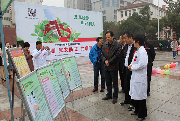 12月1日上午,我校在文化广场举办以“主动检测,知艾防艾,共享健康”为主题的艾滋病日宣传活动。副校长肖圣龙出席活动。