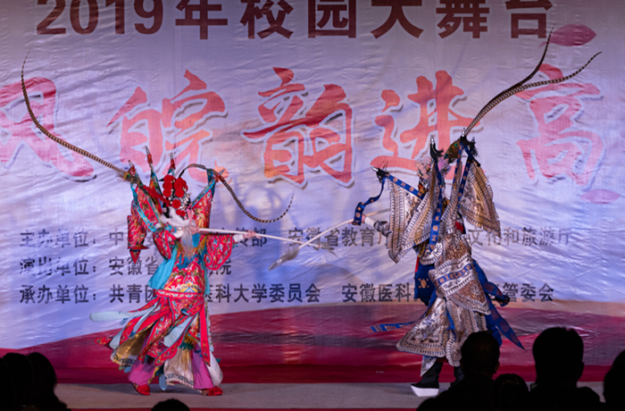 10月15日晚,由中共安徽省委宣传部、省教育厅、省文化和旅游厅主办的2019年校园大舞台“徽风皖韵进高校”活动走进我校南校区,来自省徽京剧院的演员们用精彩的演出展现出传统戏曲的独特魅力。校长曹云霞、副校长肖圣龙现场观看演出。