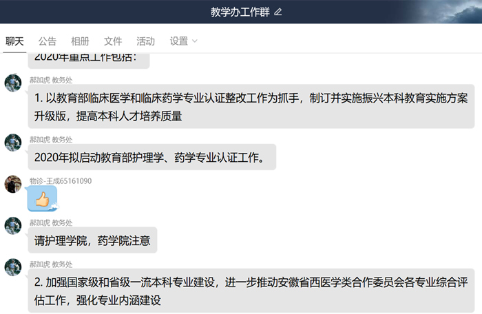听取各单位工作汇报后,吕雄文提出四点要求。一是切实提高政治站位。要坚决贯彻上级部署,充分认识本次疫情防控工作的复杂性和艰巨性,以对广大师生医护员工生命高度负责的态度投入各项工作。二是狠抓教学工作落实。要落实好疫情防控期间的在线教学工作,有效保障在线学习与线下课堂教学质量实质等效。三是统筹规划各项工作。要对标学校第八次党代会的部署和要求,做好疫情防控的同时统筹抓好教育教学各项工作,高质量推进人才培养,做到两手抓、两手硬。四是制订开学工作预案。要坚决杜绝侥幸心理,要做好学生返校后学校教学工作应急预案,确保各项工作万无一失。