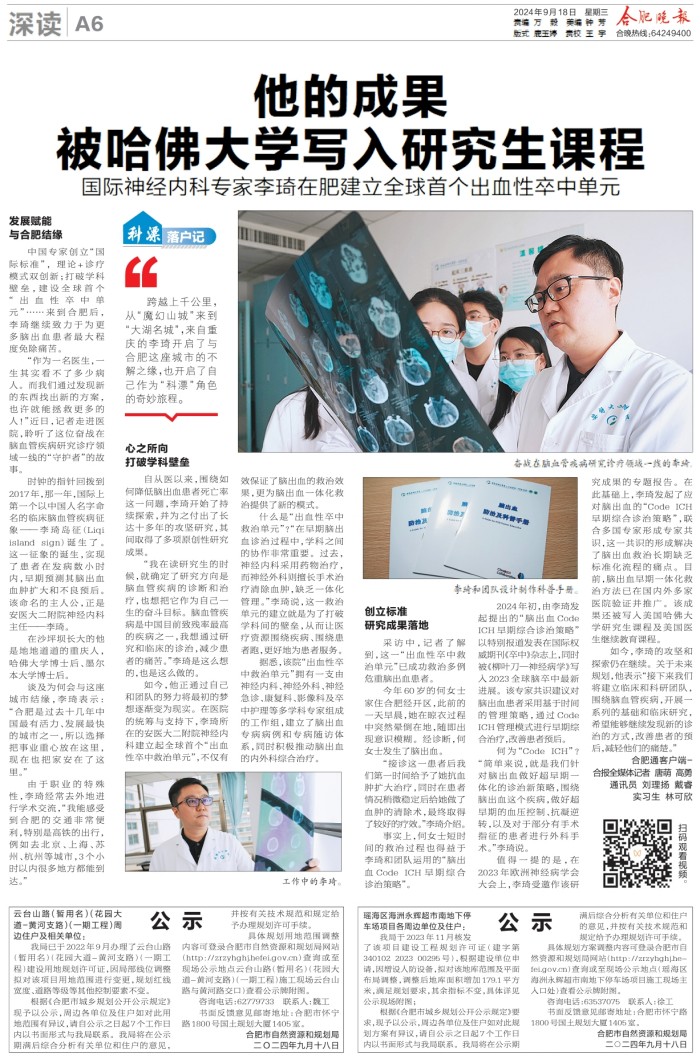 中国专家创立“国际标准”, 理论+诊疗模式双创新;打破学科壁垒,建设全球首个“出血性卒中单元”……来到合肥后,李琦继续致力于为更多脑出血患者最大程度免除痛苦。