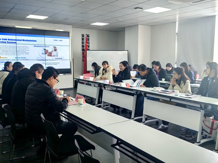 座谈中,安龙基因市场部负责人就企业肺癌甲基化检测研发产品以及相关出口情况作了详细介绍,参会教师就相关科研合作进行深入探讨,参会研究生就癌症检测研发进行咨询讨论。